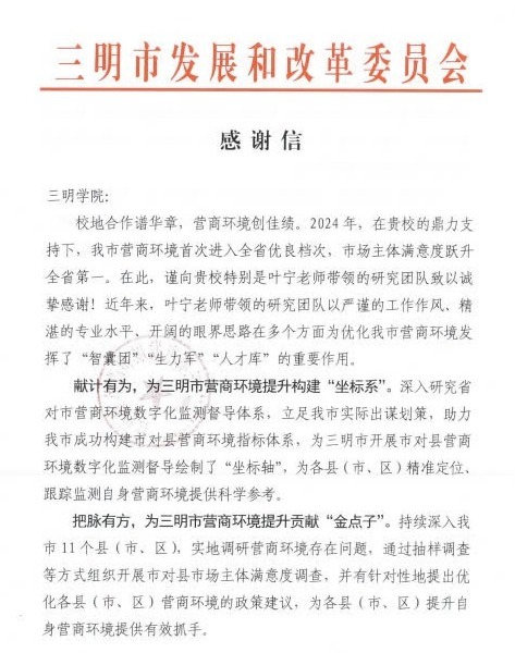 近日,三明市发展和改革委员会向米兰手机版app下载安装发来感谢信,高度肯定经济与管理学院及叶宁老师营商环境研究课题团队在优化全市营商环境工作中发挥的重要作用。2024年,在学院和研究团队的协同努力下,三明市营商环境首次进入全省优良档次,市场主体满意度跃居全省第一。