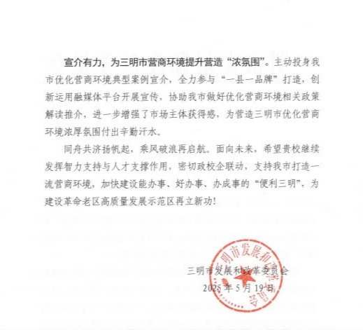 三明市发改委在信中表示,希望未来继续深化校地合作,共同推动三明市打造“能办事、好办事、办成事”的一流营商环境,为革命老区高质量发展示范区建设贡献力量。