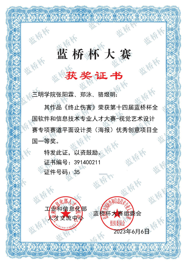 在第十四届蓝桥杯艺术设计赛道全国总决赛中,艺术与设计学院学生张阳霖、郑泳、骆煜明的作品《终止伤害》指导老师唐艺秦荣获视觉艺术设计赛专项赛道平面设计类(海报)优秀创意项目全国一等奖。