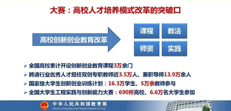 近年来,为深入贯彻落实习近平总书记关于教育的重要论述和党中央、国务院的决策部署,教育部实施了一系列有力措施促进创新创业教育改革,特别是联合11家中央单位和地方省级人民政府,打造了中国国际互联网+大学生创新创业大赛,到今年已经是第七届。目前,大赛已经成为高等教育领域落实立德树人根本任务、提高人才培养质量的重要举措,成为推动高校创新创业教育改革的重要平台,成为展示新时代高等教育教学改革成果的重要窗口,成为世界大学生实现创新创业梦想的全球盛会。