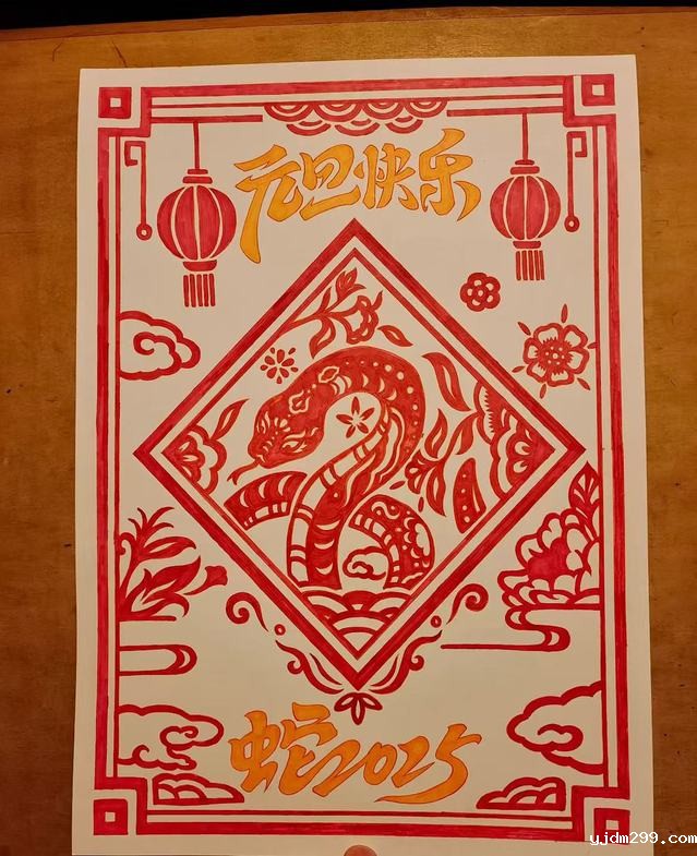 各位同学的作品从卡通可爱风到神秘写实风,风格各异的蛇形象在同学们的笔下逐渐鲜活,有些用鲜艳的色彩大胆涂抹,有些则注重细节与意境的营造,精心描绘蛇身上的鳞片,一片一片,排列整齐而富有层次感。为了突出“金蛇狂舞”的主题,他们还用流畅的线条表现出蛇灵动的身姿,仿佛正在欢快地舞动迎接新年的到来,展现出了较高的绘画技巧和丰富的想象力。巧妙地将金蛇与新年元素如鞭炮、福字、梅花等相结合,寓意吉祥。