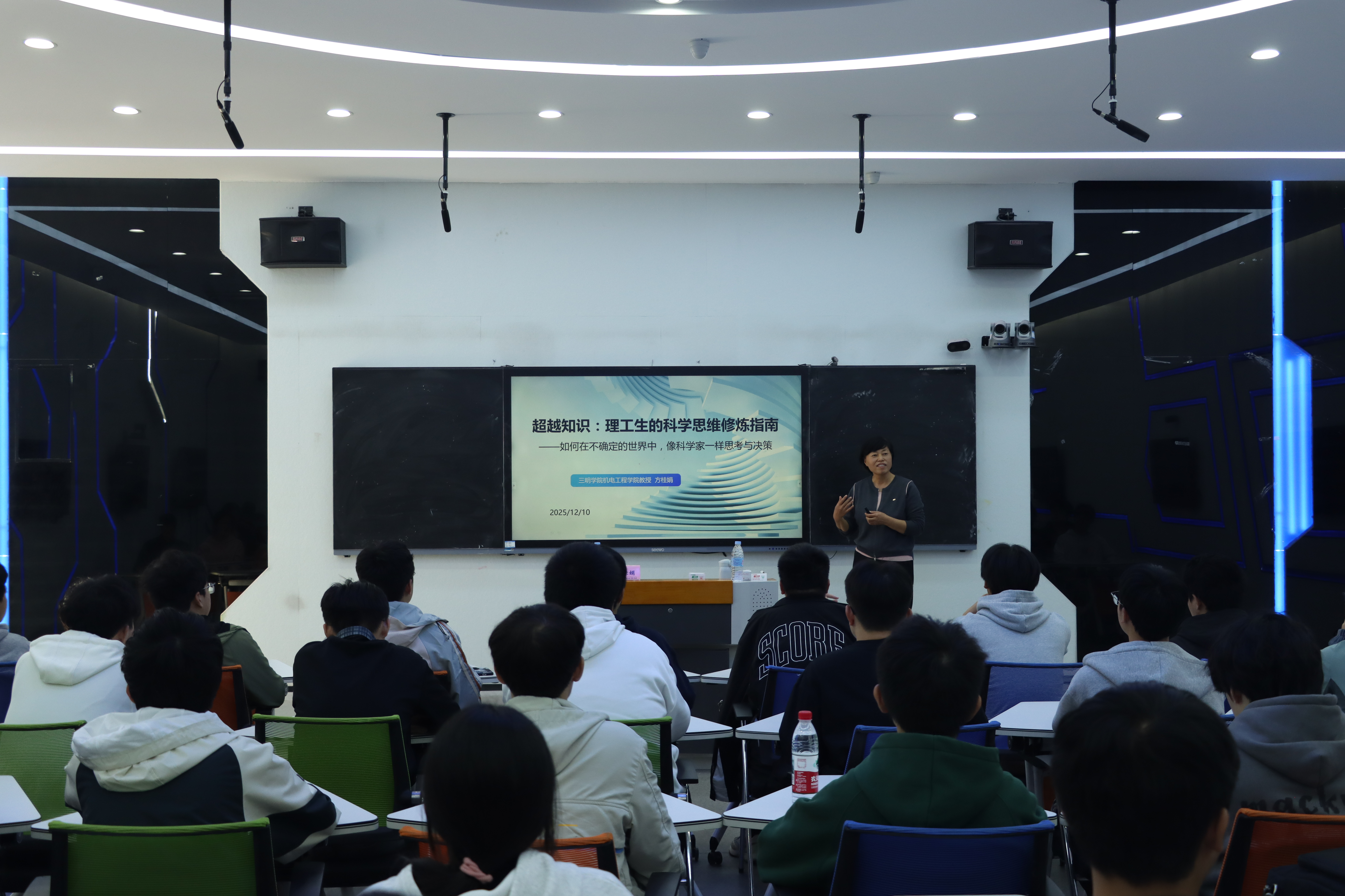方桂娟教授以《超越知识:理工生的科学思维修炼指南——如何在不确定的世界中,像科学家一样思考与决策》为主题,结合自身丰富的科研教学经验,围绕“基石篇——科学思维的四大支柱、实战篇——识别与破解常见的思维陷阱、升华篇——科学思维与理工生的未来”三个方面展开,通过丰富的实例与深入的分析,深入阐释了科学思维对理工科学生成长成才的重要意义,引导学生建立严谨的理性思考习惯,提升在复杂情境下的判断与决策能力。