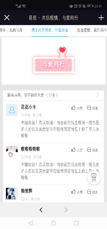 “易”起,与爱同行,共抗疫情主题活动中,参与度良好,大家都积极参与网上活动,通过在活动中发表的鼓励话语,对抗“疫”予以重视。在活动中进行留言评论,以自己的方式为国家加油,为武汉加油,向奋战在抗击疫情一线的医护人员以及其他坚守在疫情防控岗位上的工作人员致敬。
