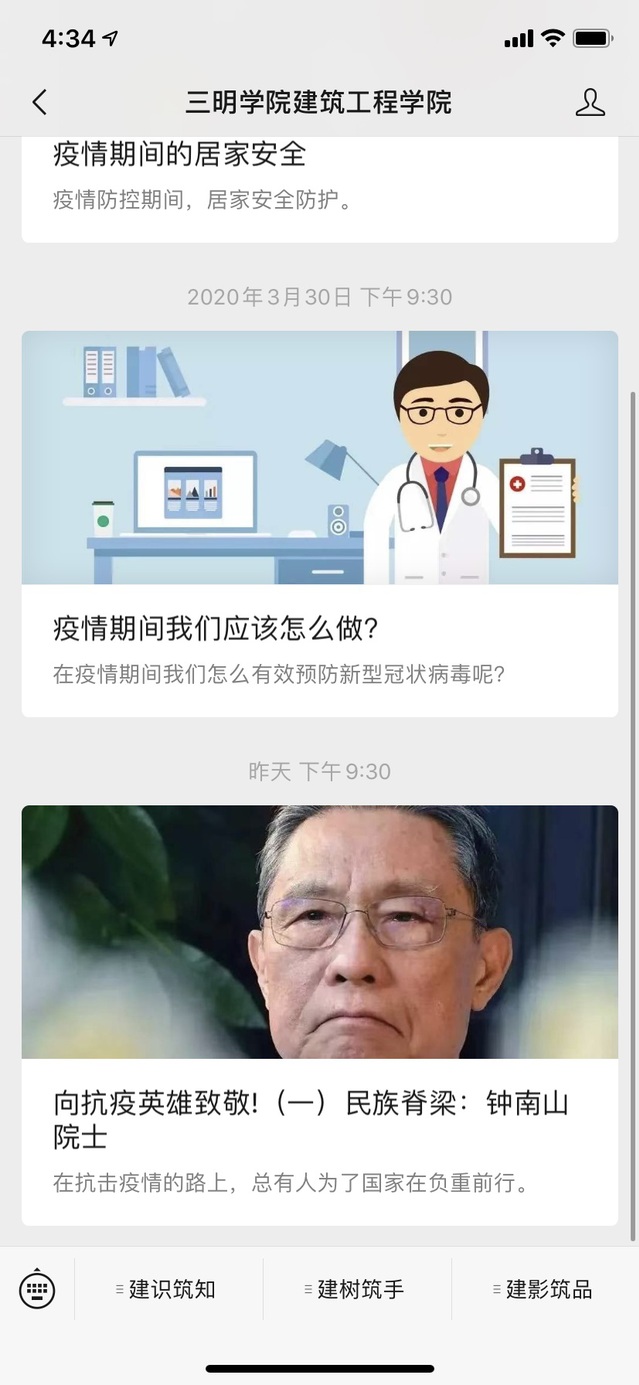 建筑工程学院宣传中心依托微信公众号平台先后策划并推出《向战疫英雄致敬!》专栏、《疫情期间我们应当怎么做》、《疫情期间我们应该怎么做》、《疫情宅家,适当运动》等推文,帮助同学们调整心态、科学抗疫。团委学生会和其他学生社团积极组织我院学生参加“三明三康”自主学习活动,并相继举办“活出自己的美,像花一样绽放”摄影活动,“铸就梦想,成就未来”建筑术语知识竞赛,“清明祭英烈,遗志永传承”网上祭奠英烈活动等系列活动,在丰富学生的课余生活同时引导同学们坚定抗疫信心,积极抗疫。