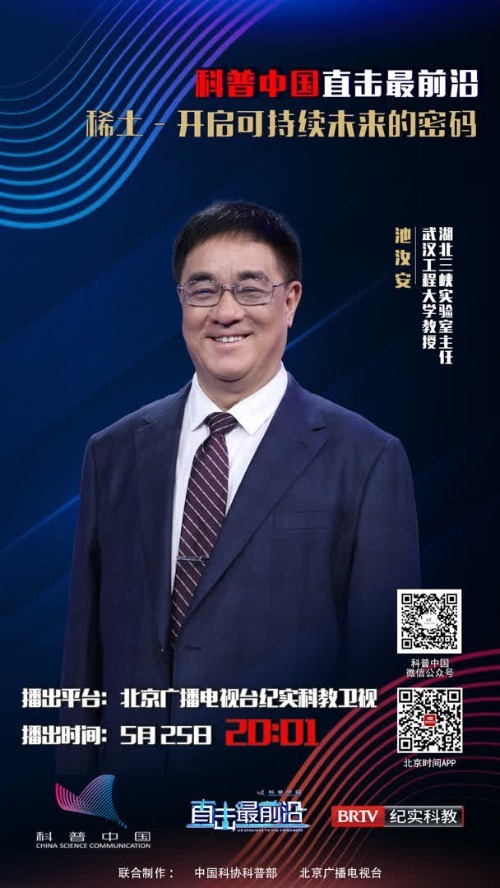 5月25日,我国稀土领域著名专家,武汉工程大学兴发矿业学院池汝安教授携团队成员张臻悦教授、余军霞教授、周芳教授、刘德峰副教授和赵庆彪副教授参与录制的国内首席科学家电视科普专题节目《科普中国-直击最前沿》,在北京广播电视台纪实科教卫视播出。池汝安教授开展了题为《稀土——开启可持续未来的密码》的科普演讲,深入浅出地解读了稀土资源的发展史及应用领域,首次向公众全景式揭示稀土资源的战略意义、中国稀土科技自主创新历程及绿色可持续发展路径。节目播出后引发了学术界、工业界与公众的广泛关注。