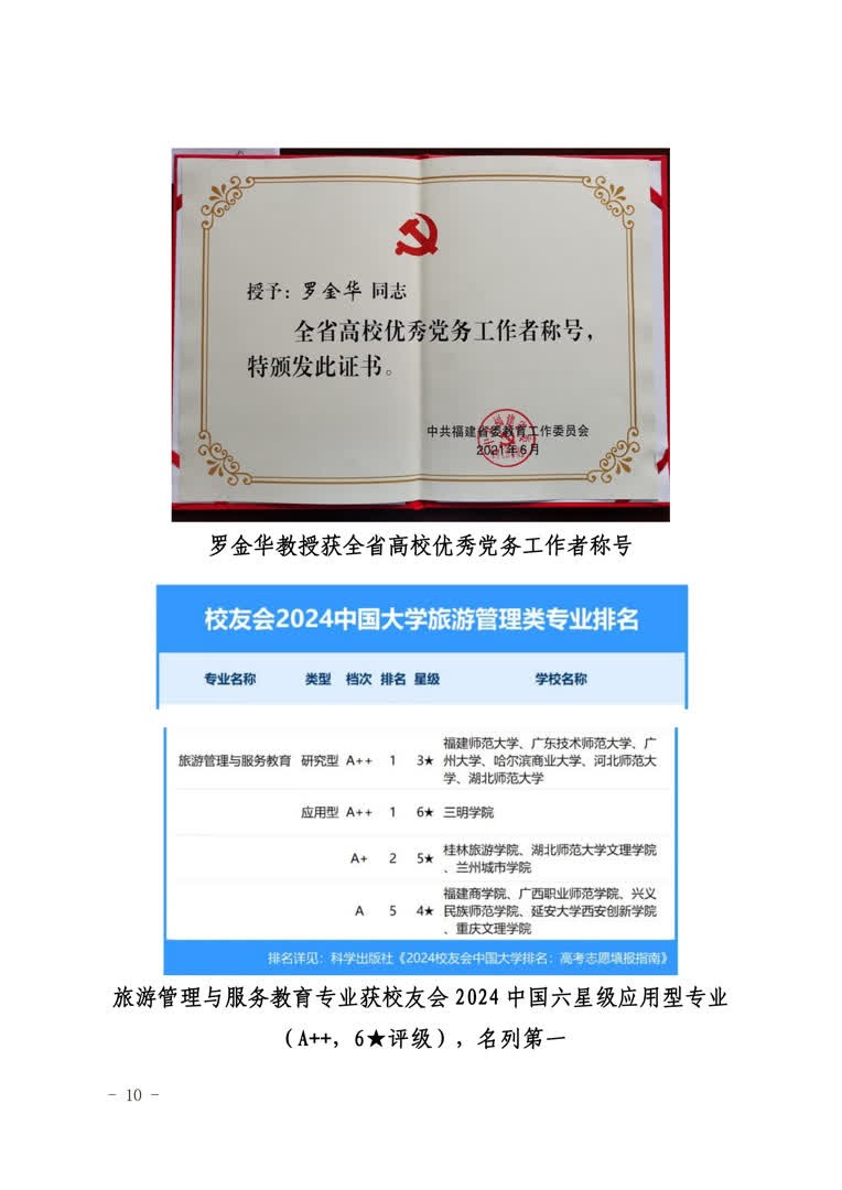 经济与管理学院旅游管理系教工党支部现有党员16人。支部顺利通过全省党建工作样板支部验收,下设旅游管理与服务教育专业现为国家级一流本科专业建设点,获得2024中国六星级应用型专业(A++,6★评级),进入中国顶尖应用型专业行列,名列第一,获教育部旅游管理专业国家虚拟教研室TOP100成员院校。支部女教师团队获得三明市巾帼文明岗称号,支部1名党员获福建省高校优秀党务工作者荣誉,共有9人次获校优秀共产党员等荣誉。