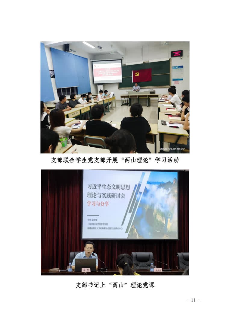 1.夯实理论武装,入学科发展之脑。精准定向专题理论学习,学习深度和精度大幅提升,由“大水漫灌”向“精准滴灌”转变。支部构建“党建引领业务融合、理论引向实践融通”的“双引双融”学习机制,将习近平生态文明思想作为重要学习内容,根据学科定位、专业属性和三明地方特色创新开展“两山”理论专题党员微党课、教学沙龙和科研讲堂等活动,引导党员深刻把握“两山”理论的科学内涵和实践要求,感悟思想伟力,汲取奋进力量,推动学科发展。