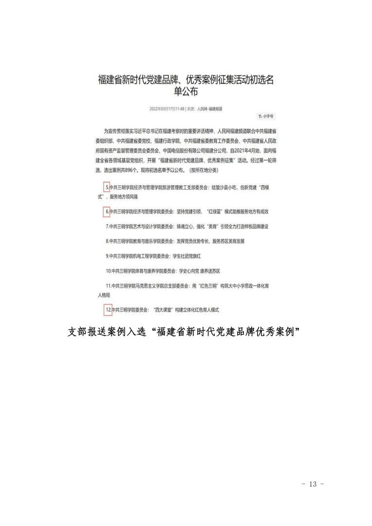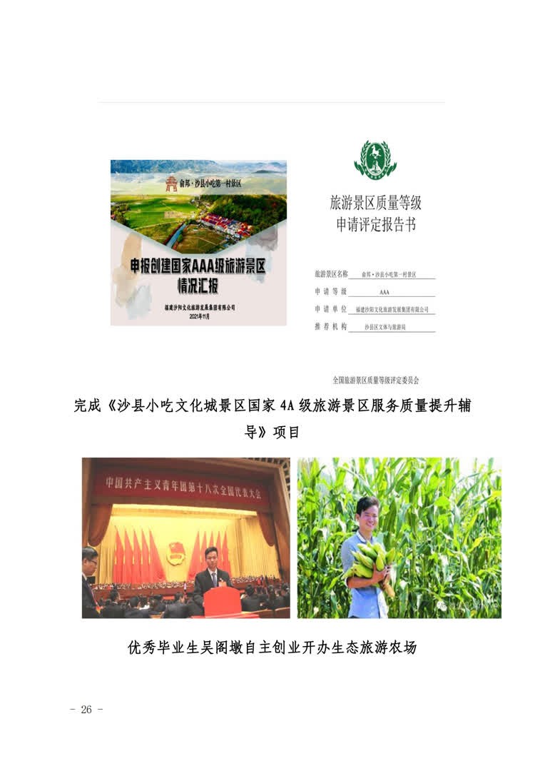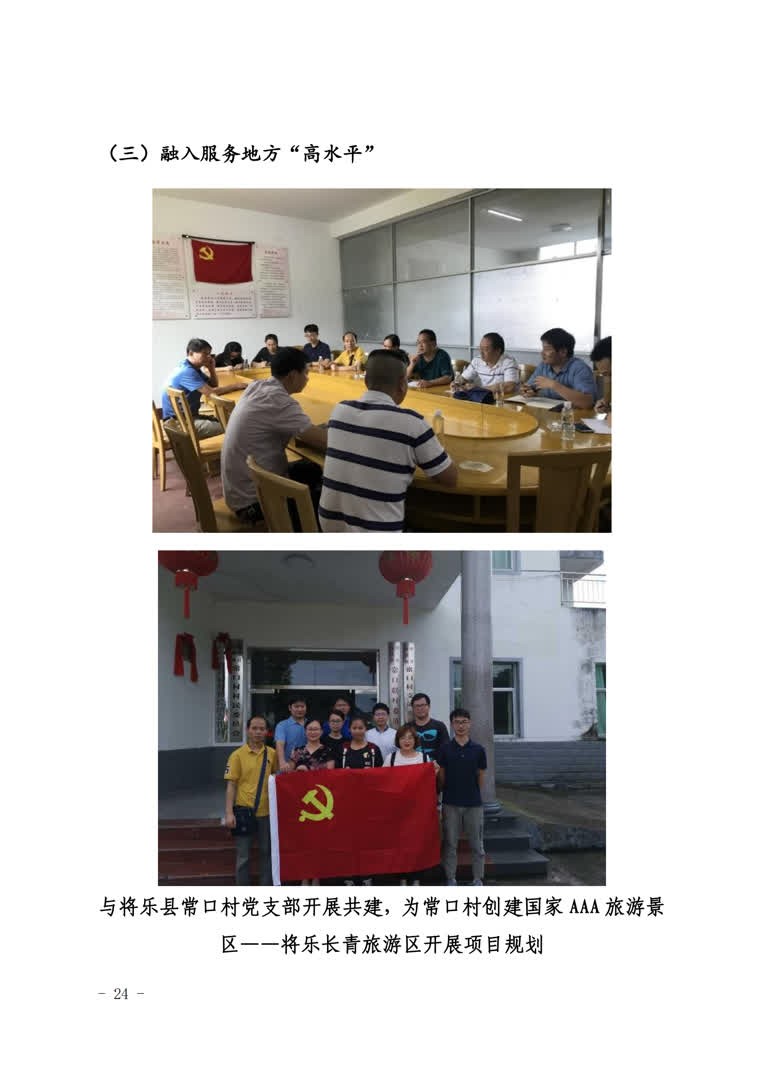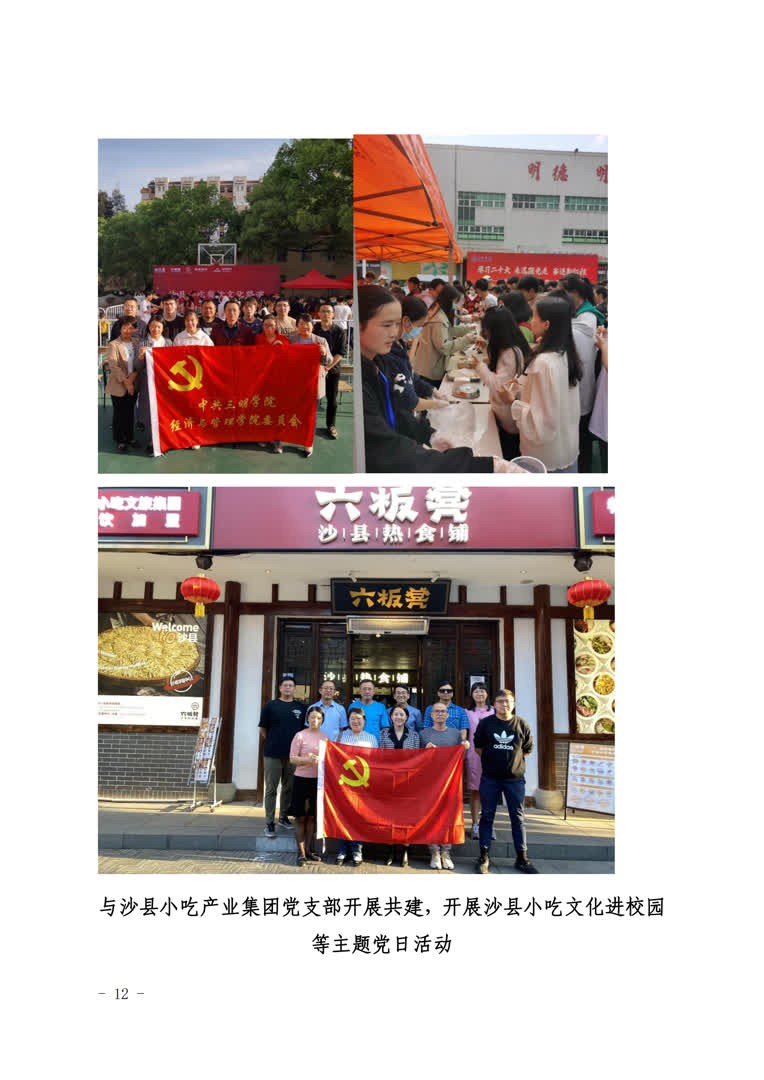 3.联建机制,共赢促发展。强化资源整合,融合多方力量,以“小机制”拓宽服务发展“大格局”。与全国样板支部旅游管理与服务教育专业学生党支部联建,以社会实践和科研实践为平台,实施教师党员与学生党员结对子活动,引领学生在实践中践行使命担当。与沙县小吃产业集团党支部开展共建,开展沙县小吃文化进校园等主题党日活动。与将乐县常口村党支部开展共建,为常口村创建国家AAA旅游景区——将乐长青旅游区开展项目规划。