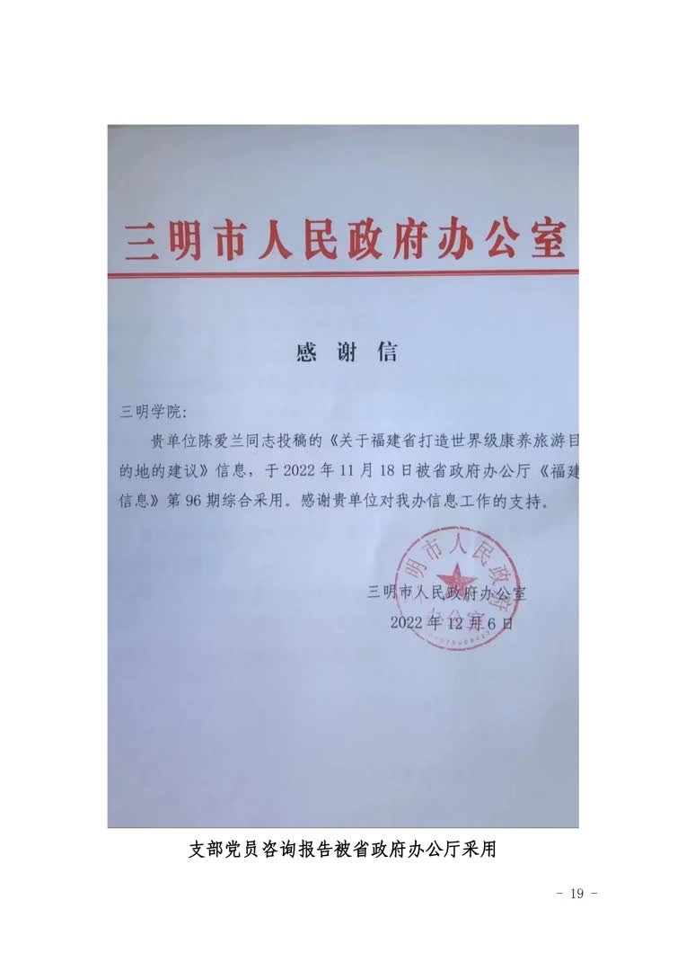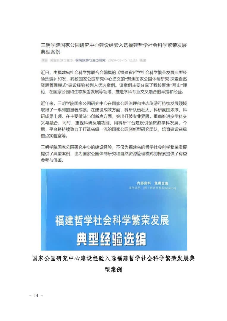 2.实施“智哺”行动,入产业发展之脑。精准定位米兰国际彩票下载,实现教学研究与产业发展的“貌合神离”向“水乳相融”转变。支部充分发挥地方高校智库优势,组织党员依托国家公园研究中心、福建省低碳经济研究中心和三明市休闲旅游发展研究中心等平台,围绕“两山”理论、“双碳”战略、沙县小吃和三明林改等领域进行学习和研究,深入基层宣讲创新理论,承担旅游发展规划项目助力产业,撰写咨政报告建言地方发展。