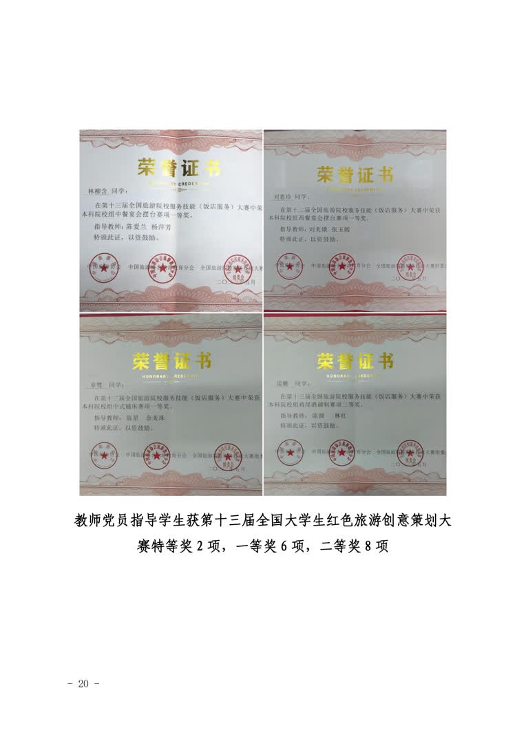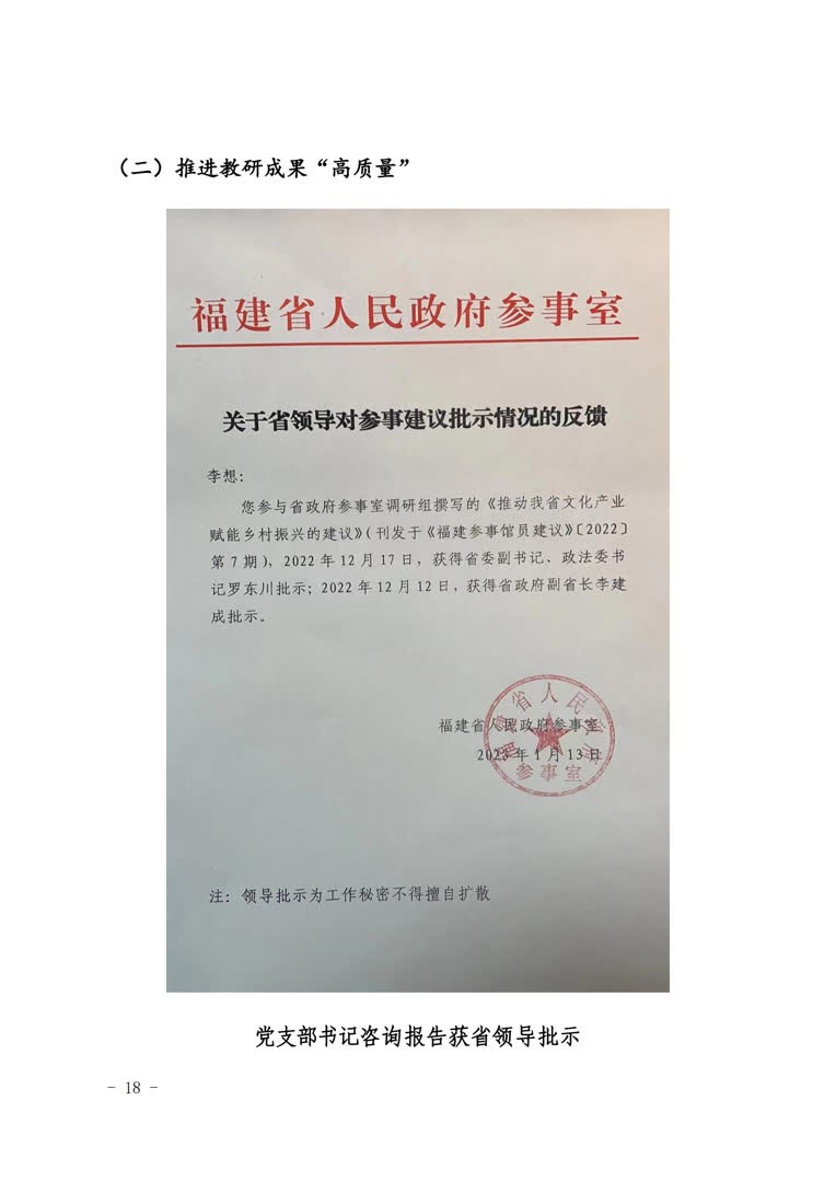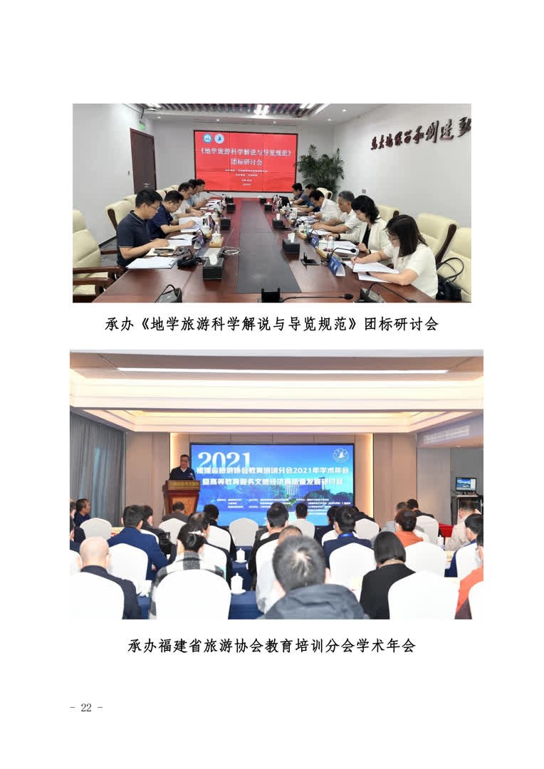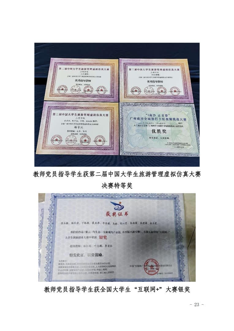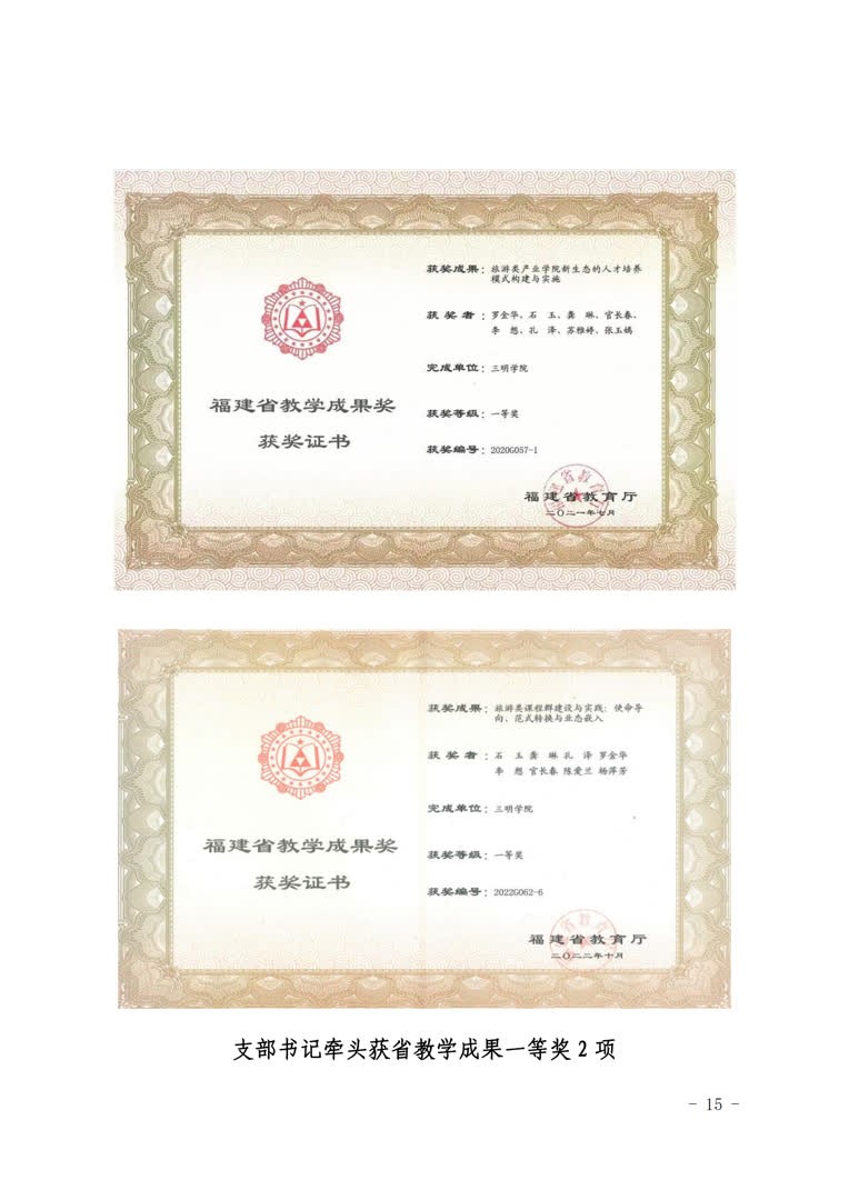 2.推进教研成果“高质量”。支部成员在“两山”理论内涵解读与文旅生态价值转化方面完成国家级课题1项,省部级课题17项,发表高水平论文30余篇,承担教育部旅游管理类教指委《旅游心理学》课程思政示范课1门,省级课程思政课题3项。出版《美丽中国的福建路径研究》《中国自然遗产保护的国家公园管理模式研究》专著2部,省直部门采纳咨询报告4篇,其中1篇获省领导批示优秀奖,承办国家级学术会议4场。组织学生围绕“两山”理论转化主旋律,参加国家级、省级竞赛获奖60余项,其中获全国大学生“互联网+”大赛银奖1项,第二届中国大学生旅游管理虚拟仿真大赛决赛特等奖1项。