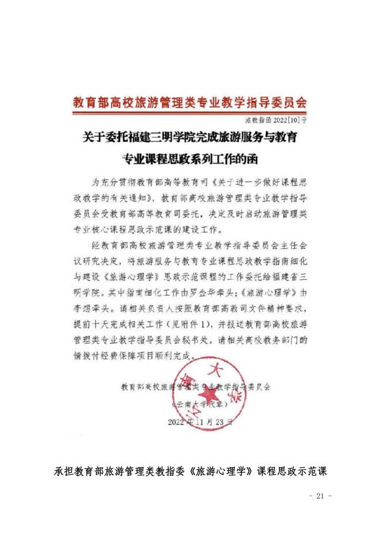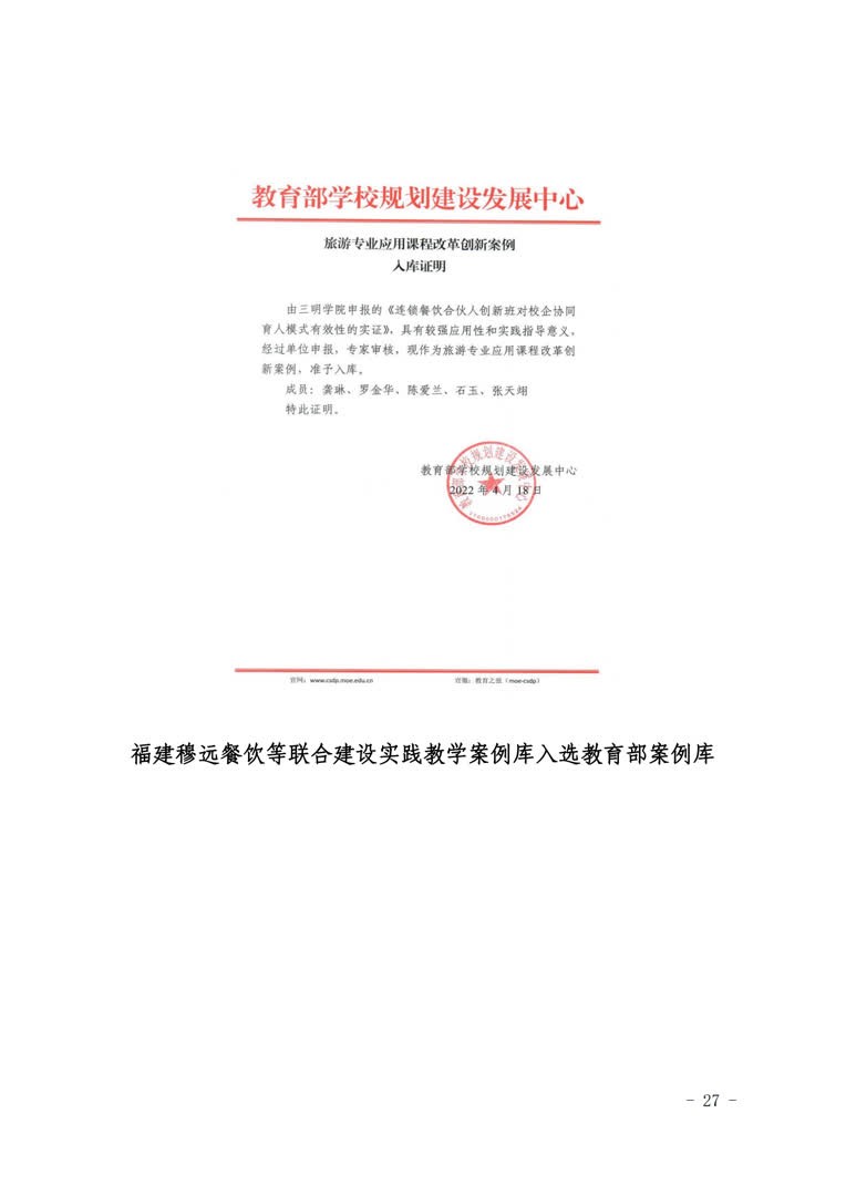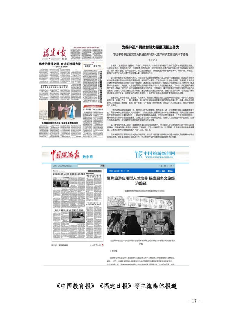 3.融入服务地方“高水平”。近两年,服务地方团队开展万寿岩—格氏栲打造国家5A级景区创评、将乐县常口村创建国家AAA旅游景区等“绿色+生态康养”等服务地方项目20余项,合同金额536万元,并帮助沙县南霞乡成功申报全国森林康养基地。与厦门建发集团、福建穆远餐饮等联合建设实践教学案例库10余个,其中1个案例入选教育部规划建设中心案例库,2个案例入选全国旅游专业应用型课程改革创新案例。闽宁协作暑期实践团队获团中央嘉奖。